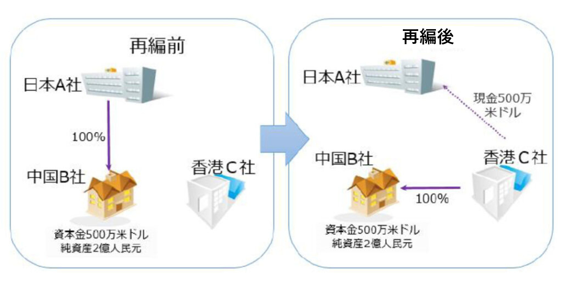 グループ再編を行うことになり、日本A社は「資本金500万米ドル、純資産2億人民元である中国B社」の持分を関連会社である香港C社へ譲渡することになりました。その際の譲渡価格は、当時出資した金額500万米ドルと同額をそのまま設定し、香港C社から日本A社へ支払いは現金500万米ドルが支払われたとします。