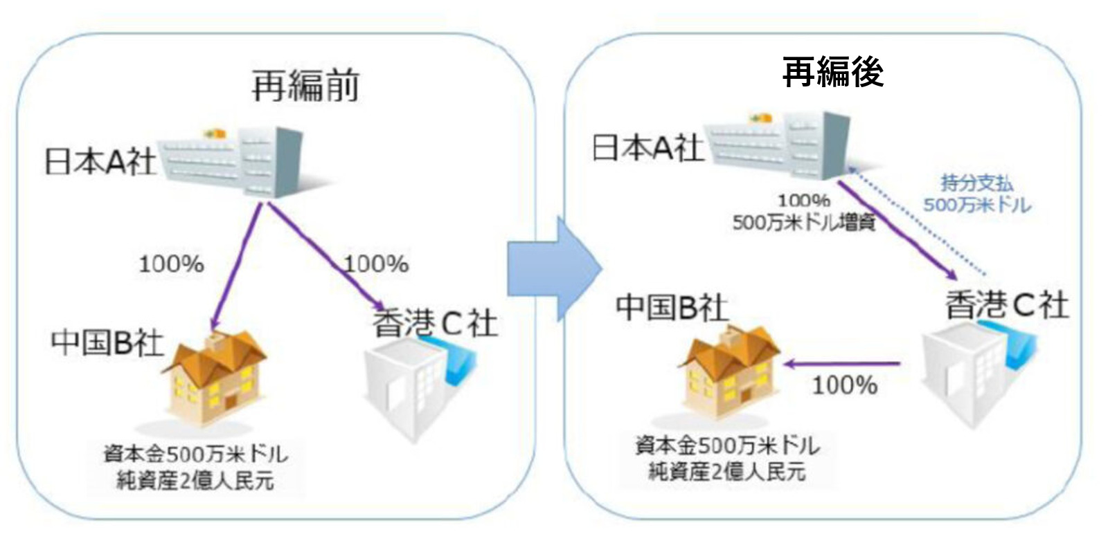 つまり、日本A社は、中国B社の持分500万米ドルにより、香港C社へ現物出資(増資)を行い、C社はA社へ新規割当による株式を発行するということになります。このように、株式による対価の支払いを”持分支払い”と言います。
