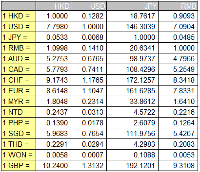 每月更新兩個匯率表中,第一個表格(上表)是按”香港銀行公會”公佈的上月月末日的匯率,第二個表格(下表)是按 “汇率牌价公示網站(Oanda)” 公佈的上月月末日的匯率。