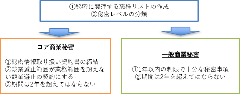 まずは自社の秘密事項に関与する職種リストを作成します。次に、秘密事項のレベルを分類します。これは例えば企業秘密として核心的な秘密なのか、一般的な商業的な秘密であるのかなどに分類をします。