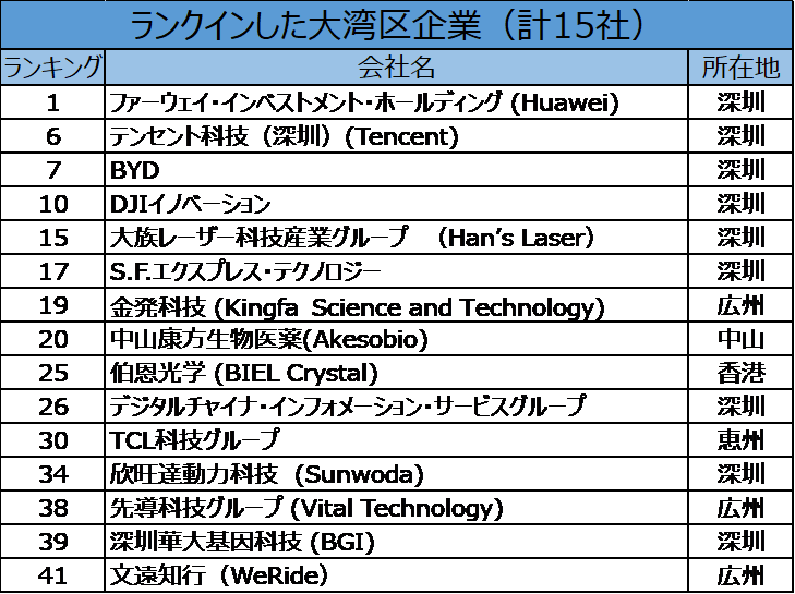 ランキングによると、ファーウェイ(Huawei)、テンセント(Tencent)、BYD、デジタルチャイナ(Digital China)、TCL、Sunwodaの6社が継続して選出され、一方、DJI、大族レーザー(Han’s Laser)、S.F.エクスプレス(SF Express)、金発科技(Kingfa Science and Technology)、康方医薬(Akesobio)、先導科技(Vital Technology)、華大基因(BGI)、文遠知行(WeRide)の8社が新たにランキング入りを果たしました。