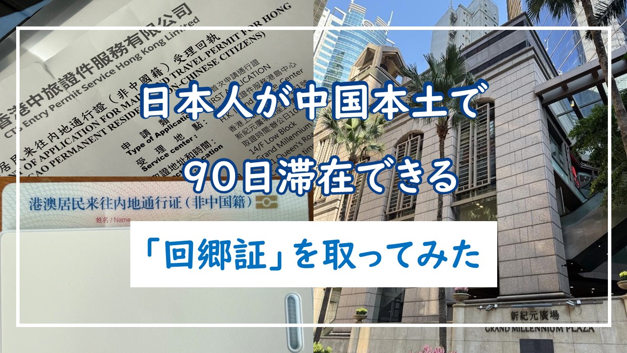 「回郷証」の正式名称は、「港澳居民来往内地通行証(非中国籍)」(英文名称:Mainland Travel Permit for Hong Kong and Macao Permanent Residents (Non-Chinese Citizens), 通称MTP card)といい、、俗称として「回郷証」、「回郷卡(カード)」、「Home Return Permit」などと呼ばれています。