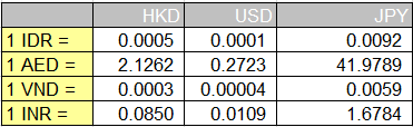 毎月の2つの表のうち、1つは前月最終日の”The Hong Kong Association of Banks”から、2つめは前月最終日の”Oanda, The Currency Site”からの為替レートです。
